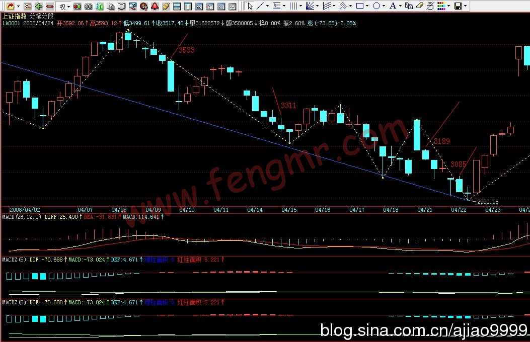 注意,由于这里文科生理科生太多,对理论的严密性与实践中的经验性分别不清楚,因此本ID必须严重指出,除了上面的理论严密下的2990点的100%确保幅度,还有一个实践中的经验性幅度,就是整个下跌的1/3,这肯定不是100%保证的东西,但实践中确认,一般都有90%以上的准确性,因此,这个幅度,就是一个参考性的幅度,所以,本ID前面说,这个反弹基本可以回到3700点上,但这是在经验性的角度说的,而在本ID理论的确保性上说,只能说是2990点。