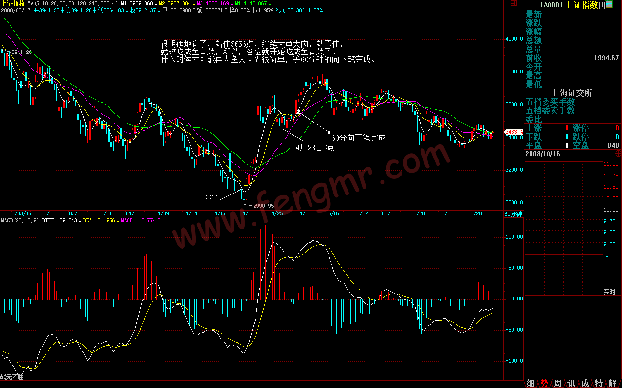 你看透市场以后,反弹不过就是一个419的约会。今天,昨天的预约如约而来,4根60分钟线,前三根构造分型,确认后,第四根突破分型上边,3311点成短线关键位置,一切就是本ID理论的活教材,你说有什么可说的?