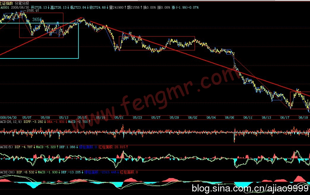 对于看不明白本ID理论或操作熟练程度有问题的人,本ID已经给出了两条路子:小板凳或主动买套并顺势降低成本。目前的大盘的中线判断,本ID已经多次说过,从3700点上开始的这一段下跌就是6124点下来的最后一个下跌(注意,这不是理论100%确保的,因为可以有大的第三中枢,但根据基本面与其他判断,基本可以否定这种情况,用最严密的理论语言,这是一种有99%把握的判断)。因此,主动买套的操作在这个最后一个下跌的内部结构出现第二中枢后,已经十分现实,特别对于大资金,是必须的。