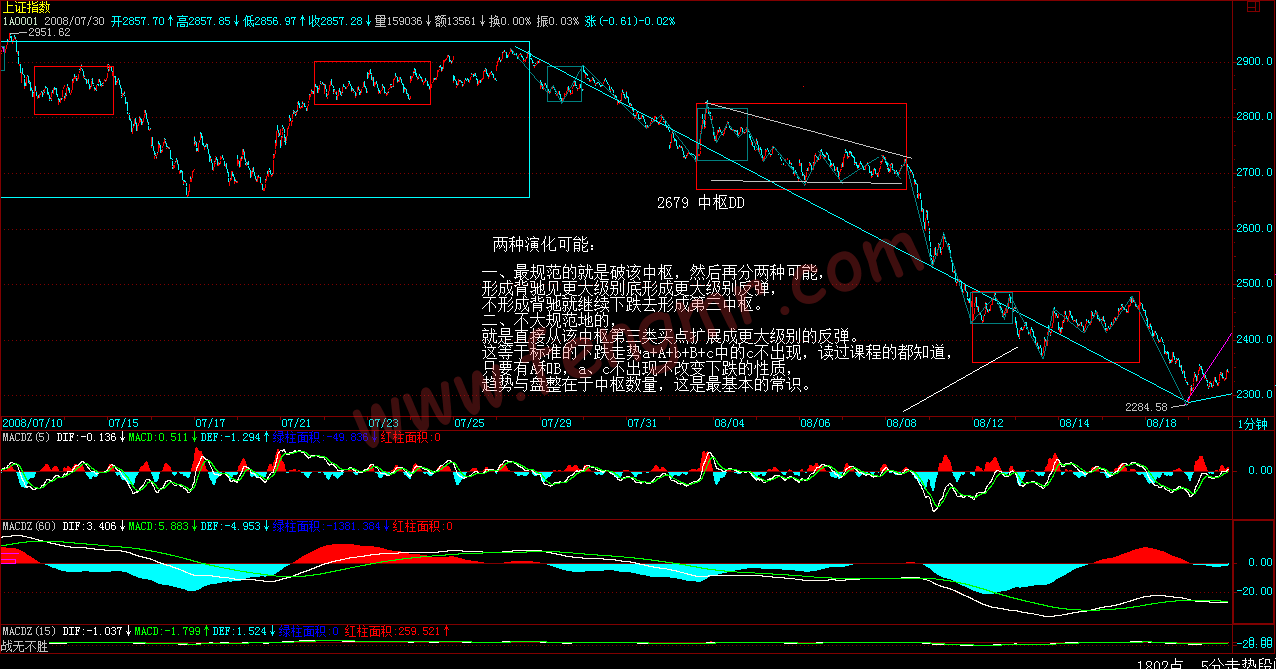 但这个反弹的出现,如果只是2924点下来的第二中枢级别,那么后面还有下跌去构成背驰完成2924点以来的下跌走势,其后的更大级别就是所谓7月以来大中枢的次级别反弹将是最为重要的,(娇注:30分中枢的5分级别反弹)是否构成第三类卖点,就看这次了,一旦构成该卖点,后面还有更断崖的下跌。(注:实际走势为此类30分中枢3卖点后断崖下跌)