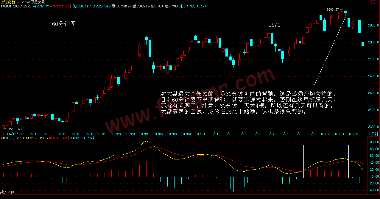 还有一种,就是股票不断一字涨停,这时候,由于MACD设计的弱点,在1分钟、甚至5分钟上,都会出现一波一波类似正弦波动的走势,这时候不能用背弛来看,最简单,就是用1分钟的中枢来看,只要中枢不断上移,就可以不管。直到中枢上移结束,就意味着进入一个较大的调整,然后再根据大一点级别的走势来判断这种调整是否值得参与。如果用MACD配合判断,就用长一点时间的,例如看30分钟。一般来说,这种走势,其红柱子都会表现出这样一种情况,就是红柱子回跌的低点越来越低,最后触及0轴,甚至稍微跌破,然后再次放红伸长,这时候就是警告信号,如果这时候在大级别上刚好碰到阻力位,一但涨停封不住,出现大幅度的震荡就很自然了。例如600385,在2。92那涨停,MACD出现一点的绿柱子,然后继续涨停,继续红柱子,而3。28元是前期的日线高位,结果3。22涨停一没封住,就开始大幅度的震荡。