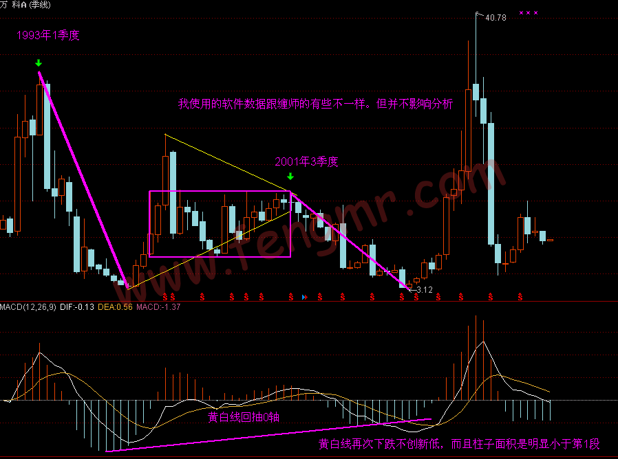 不过这种数字分析意义不大,最简单的判断还可以用MACD来,第三段跌破第一段的3.2元,但MACD明显出现标准的背弛形态:回抽0轴的黄白线再次下跌不创新低,而且柱子的面积是明显小于第1段的,一般来说,只要其中一个符合就可以是一个背弛的信号,两个都满足就更标准了。从季度图就可以看出,万科跌破3.2元就发出背弛的信号。而实际操作中,光看季度线是不可能找到精确的买点的,但对大资金,这已经足够了,因为大资金的建仓本来就是可以越跌越买,只要知道其后是一个季度级别的行情就可以了。而对于小资金来说,这太浪费时间,因此精确的买点可以继续从月线、周线、日线、甚至30分钟一直找下去,如果你的技术过关,你甚至可以现场指出,就在这1分钟,万科见到历史性大底部。因为季度线跌破3.2元后,这个背驰的成立已经是确认了,而第三段的走势,从月线、周线、日线等,可以一直分析下去,找到最精确的背驰点。