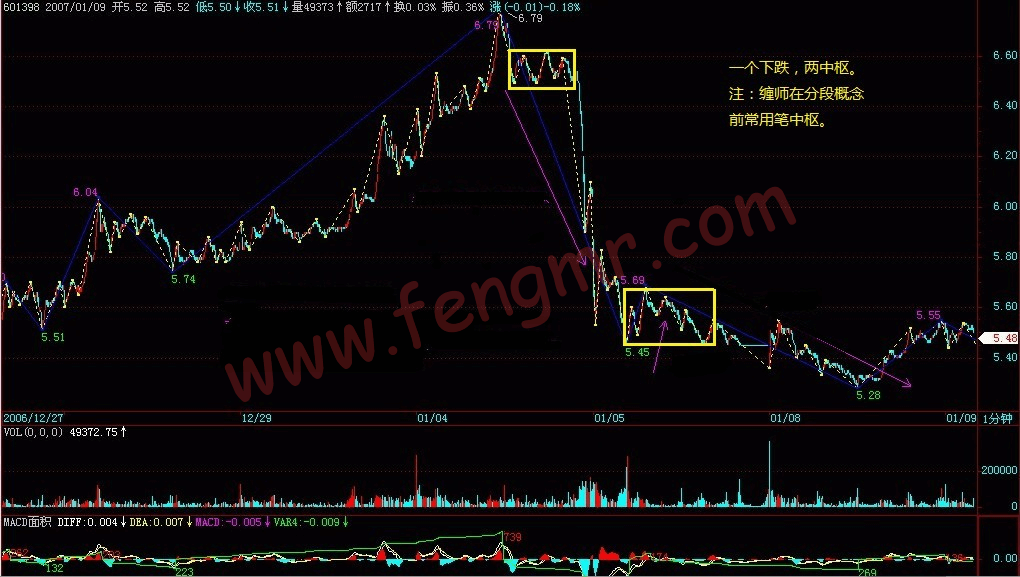 工行的问题以前已经分析,那次在1分钟上出现典型的背驰,这就是急速行情中最典型的特征,1分钟背驰引发暴跌,然后是一个下跌,两中枢,然后一个三段的B段,然后破底,到今天出现5分钟背弛,都十分标准。好好先把中枢概念搞清楚。