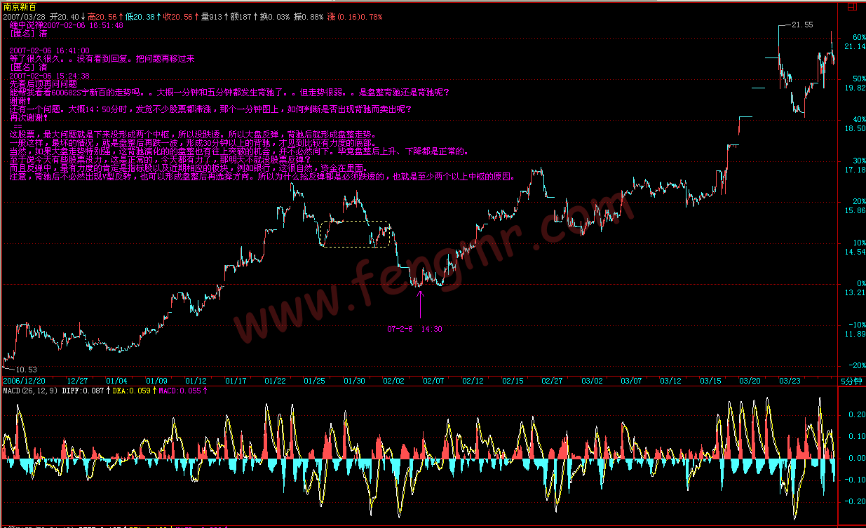 其实问的主要原因是往往在小级别的做短差,因为调整幅度如果不大,又快速拉升,往往错过买入机会,或出现帮证券所打工的结果。所以想搞清楚小级别如何判断背驰,即使在回抽0轴后,出现了新高,而MACD图上面积却同前比较减少,但立于当下,如何判别会否在下探后再次拉升,而使后面的面积增大而大于前面(回抽0轴前的面积)。
