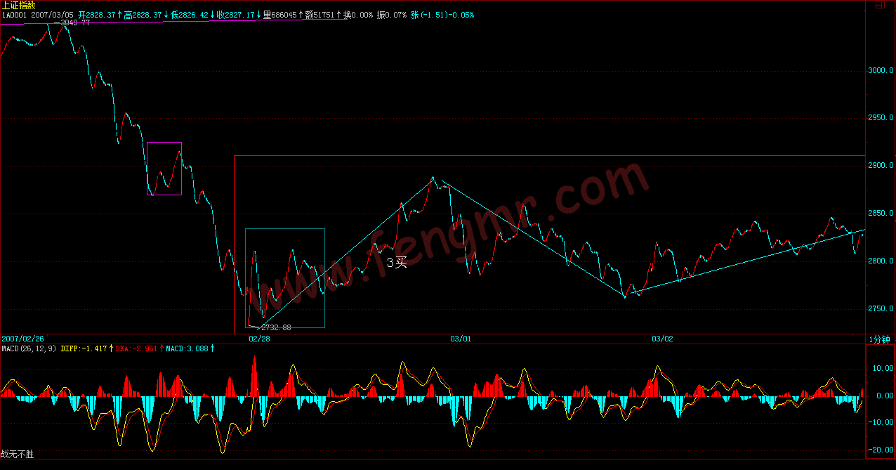 现在的走势很简单,今天早上就是一个5分钟的中枢,下午出现第三类买点后离开,现在问题的关键就是在上面是否能再出现一个中枢,如果这中枢能站稳5天线以及2915,那么就可以期待再冲3000了。如果不行,那就下来形成一个30分钟的中枢。