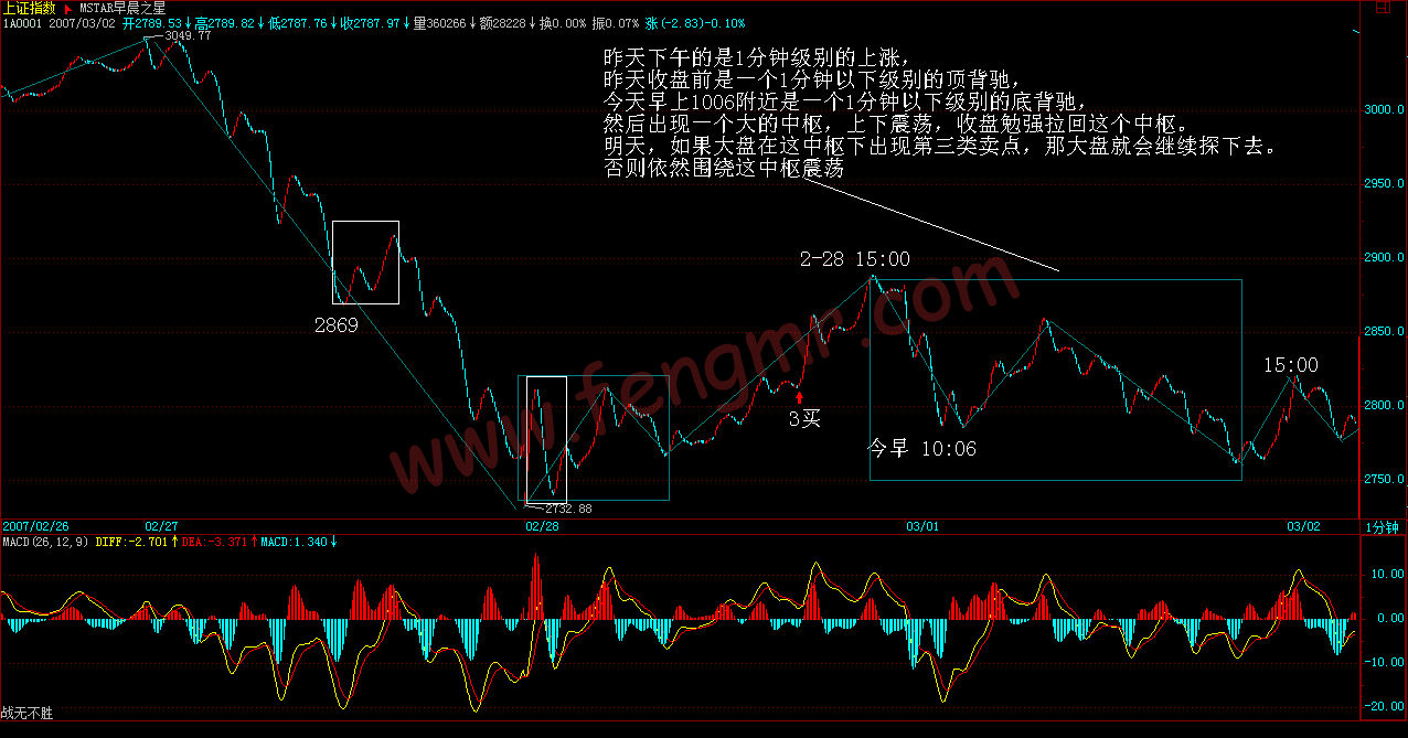 前一两天大盘走势看,分时图和1分钟图差不多,下跌第一个1分钟中枢可以认为是5分钟中枢吗?第2个是5分钟中枢也是1分钟中枢吗?分时图没有MACD看背驰,是看成交量吗?