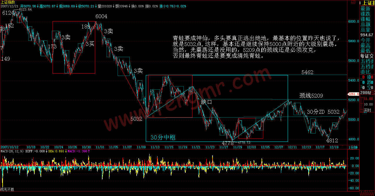 青蛙要成神仙,多头要真正逃出绝地,最基本的位置昨天也说了,就是5032点,(注:30分中枢ZD,2007年11月12日低点5032)这样,基本还是继续保持5000点附近的大级别震荡。当然,光震荡还是没用的,5209点的颈线还是必须攻克,否则最终青蛙还是要变成清炖青蛙。